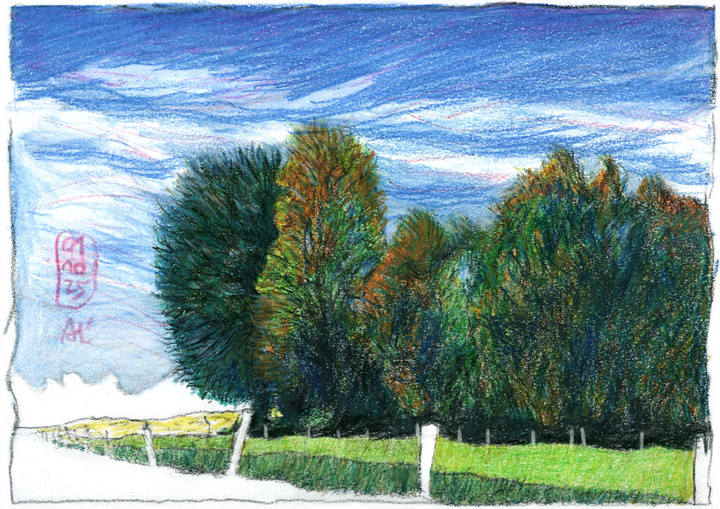 Das Auenpanorama vor meinen Augen lässt mir keine Ruhe. Wieder und wieder drängeln sich eigenwillige Baumwipfel auf meinem Skizzenbrett. Am Ende meines heutigen Abendspaziergangs lasse ich mich von meiner Frau mit dem Auto abholen. Gerade noch rechtzeitig, bevor es zu regnen beginnt.