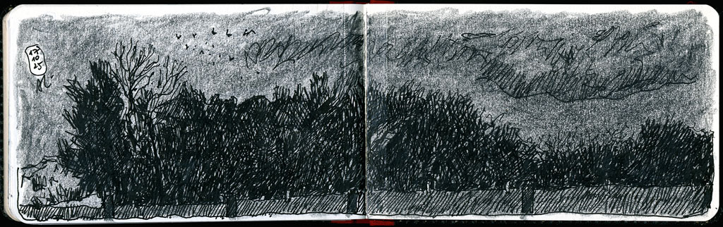Mein ältester Sohn und ich sitzen heute Abend Seite an Seite auf meiner wohlvertrauten Halbetappenbank. Während die Glocken der beiden Düsseler Kirchen sieben Uhr läuten, zieht eine kleine Schar von Graugänsen mit heiseren Schreien über unsere Köpfe hinweg an einen unbekannten Sehnsuchtsort und die Silhouette des Auenwäldchens vor schnell dunkler werdendem Wolkenhimmel in mein kleines Skizzenbuch.